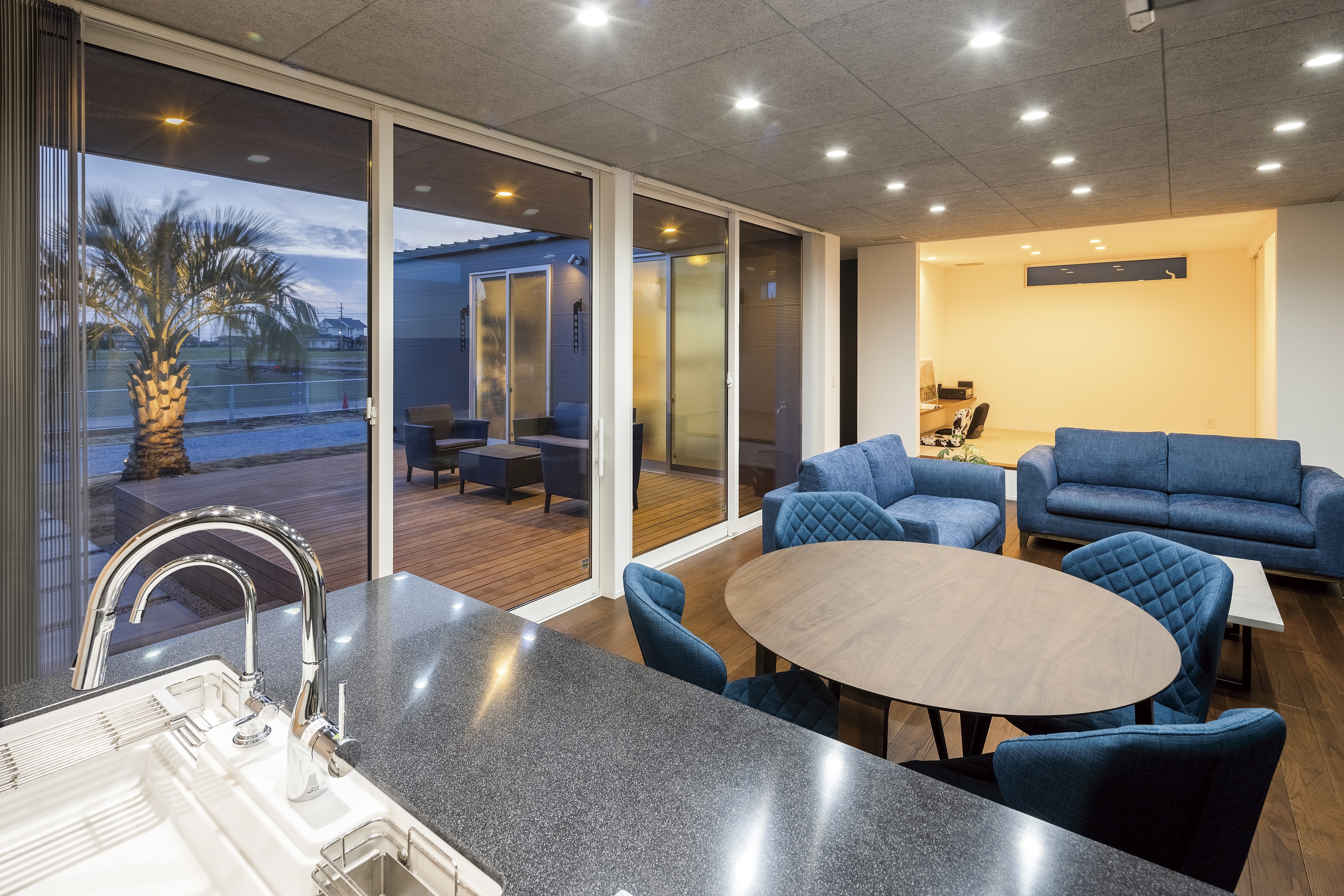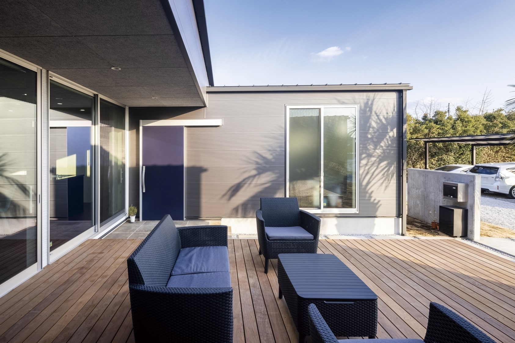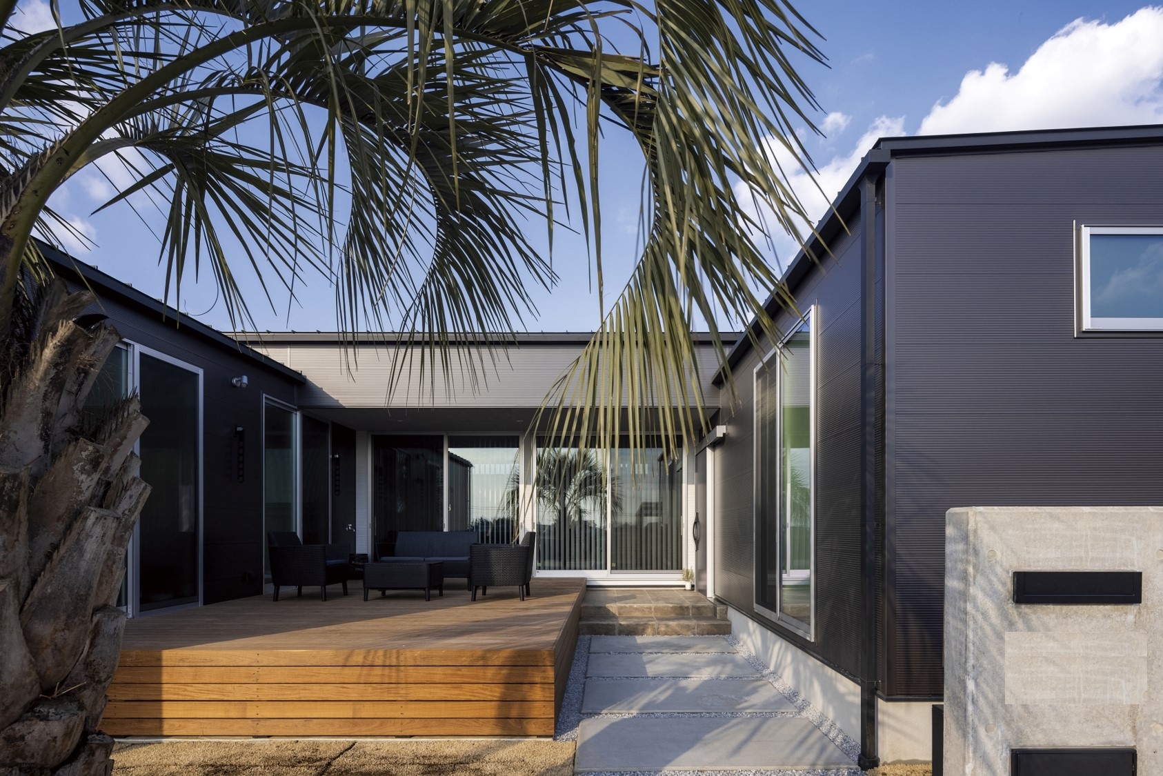 素材が光るコの字型の平屋